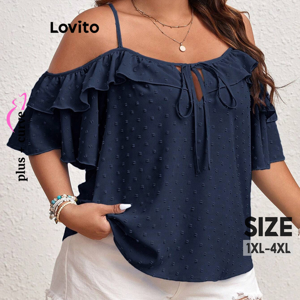 Lovito Blusa Plus Size Curva Casual Com Bolinhas E Babados Para Mulheres LBL07115