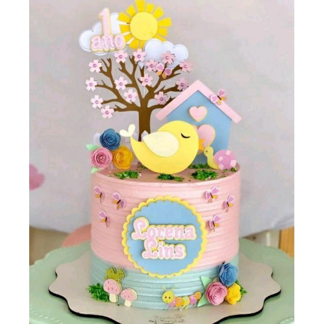 Topo de bolo com vela em biscuit tema jardim encantado, balanço jardim encantado