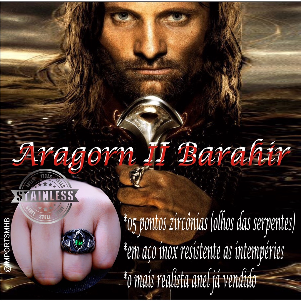 Anel Masculino Feminino Aragorn II Barahir O Autêntico Tolkien Senhor dos Anéis Acessório Vintage Serpentes Aço Maciço e Zircônias 17g