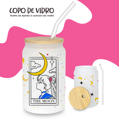 Copo Sailor Moon com Tampa de Bambu e Canudo de Vidro