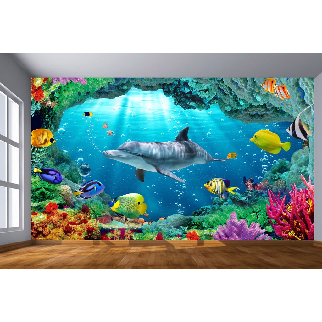 Papel de Parede Adesivo Decorativo Decoração Fundo do Mar Golfinho Peixes Tubarão Aquário Paisagem Arte FM78