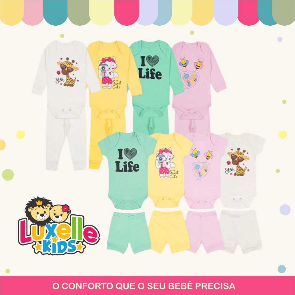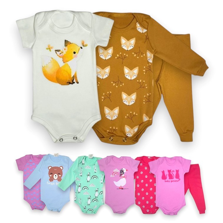 Kit 06 peças Body Bebê Curto e Tapa Fralda Short Menina Verão ou Body Longo e Calça Inverno 100% Algodão Suedine Fábrica