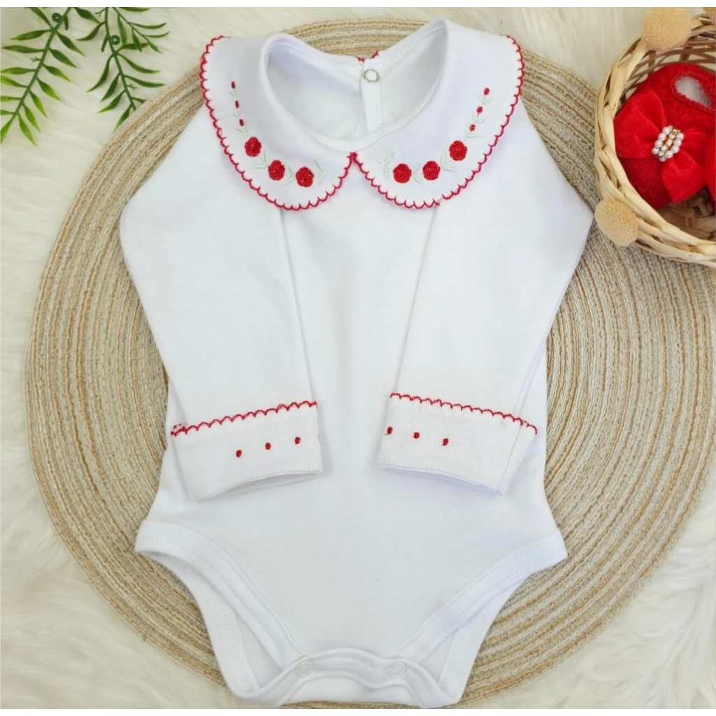 Body Bebê Menina 100% Algodão Manga Longa com Gola e Punhos Bordados Floral