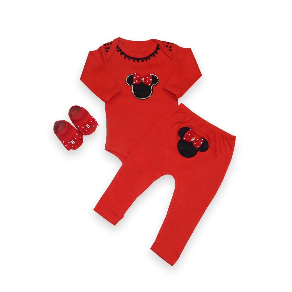 Conjunto Body Bebê Longo com Calça e Sapatinho Minnie Kit 3pçs