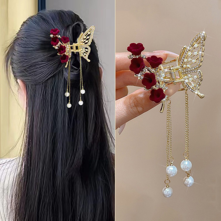 Grampo De Cabelo Retro Metal Rhinestone Tassel Hair Clip Cristal Pérola Vermelha Flor Porta Rabo De Pônei Mulher Acessórios