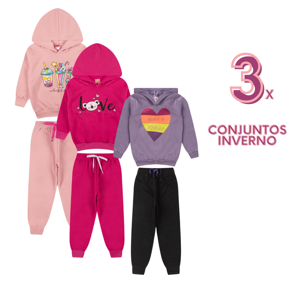 Kit 3 conjuntos Moletom com capuz peluciado feminino tam 1 ao 8 anos