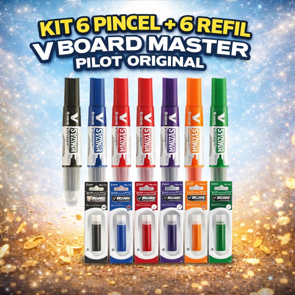 Kit 6 Caneta Marcador Pincel Quadro Branco Recarregável + 6 Refil Cartucho V-Board Master Pilot Alta Qualidade