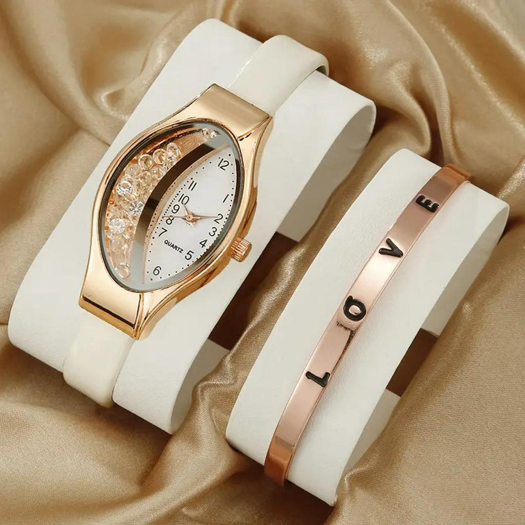 2pcs Relógio de Venda a Quente Relógio Feminino Glitter Ponteiro Oval de Quartzo Relógio de Moda Criativo Relógio de Pulso de Simulação Única e 1 Pulseira do Amor Presente Dado a Ela
