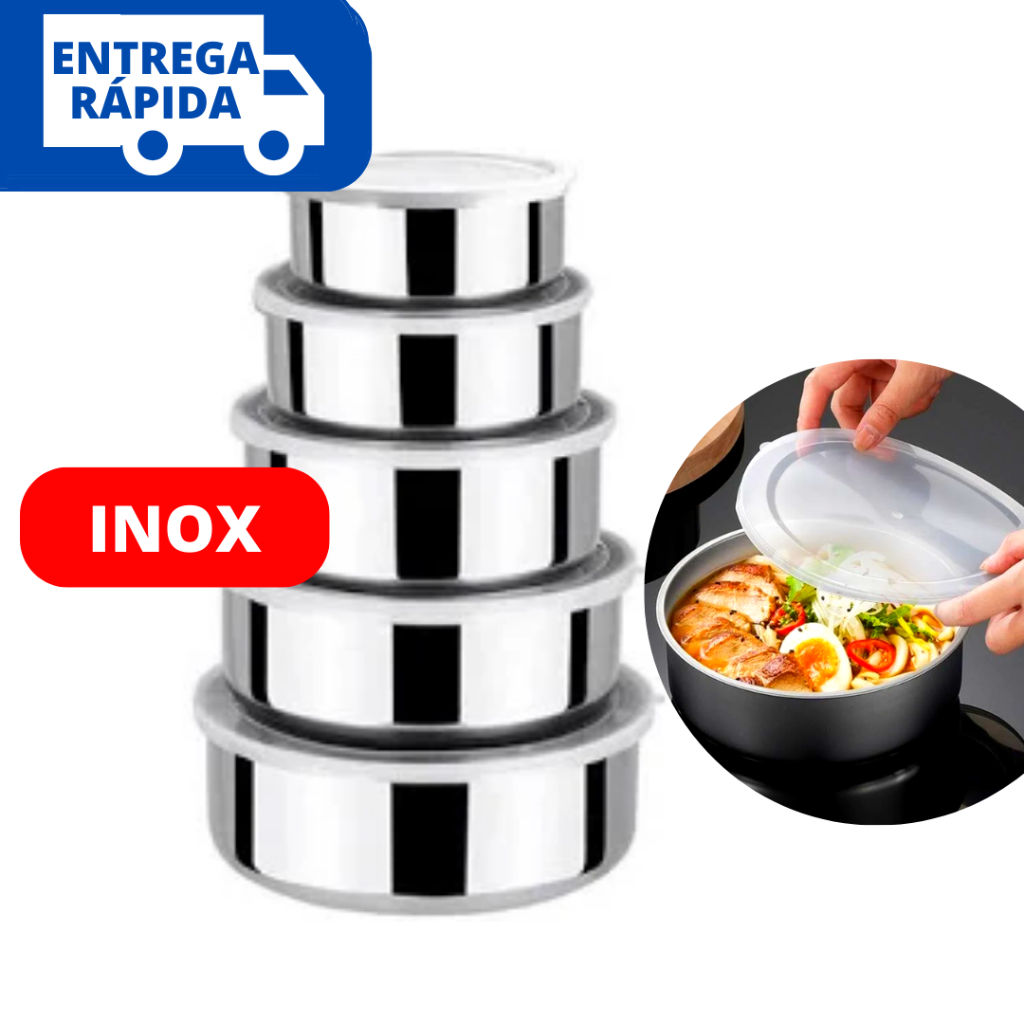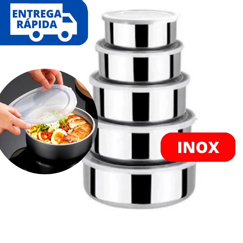 Kit Conjunto 5 Potes Vasilhas Tigelas Inox Com Tampas Para Armazenar Alimentos