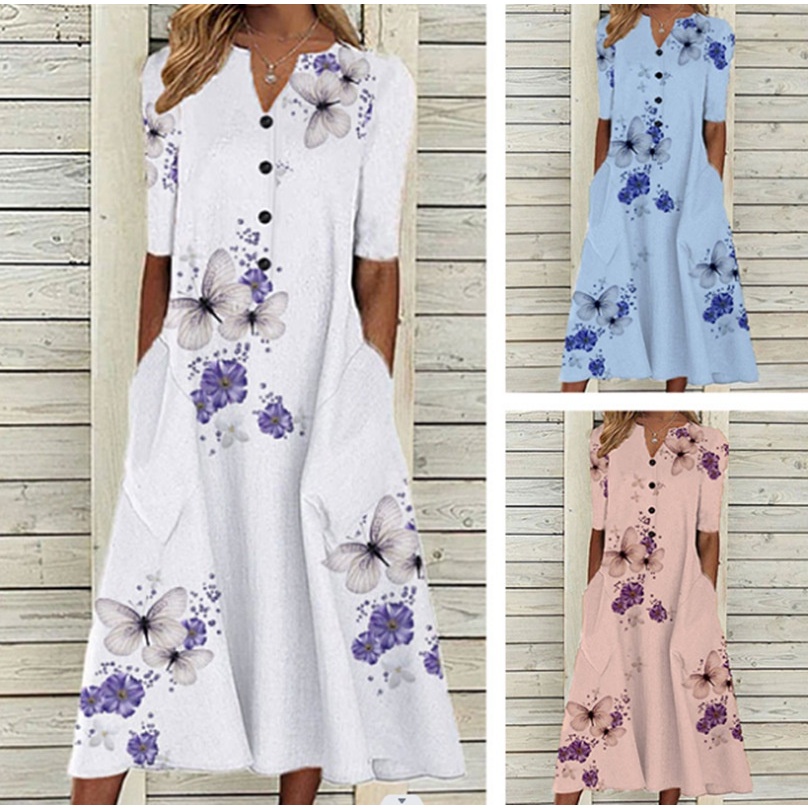 Vestidos De Moda Floral Impressos Longos Para Mulheres Meia Manga De Verão Com Em V De Bolso Casual Solto