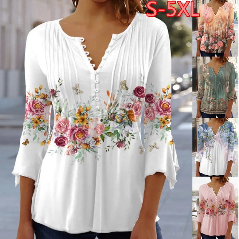 Moda Feminina Plus Size Floral Impresso Camiseta Solta Casual Meia Manga Com Decote Em V Blusas Topo XS-5XL
