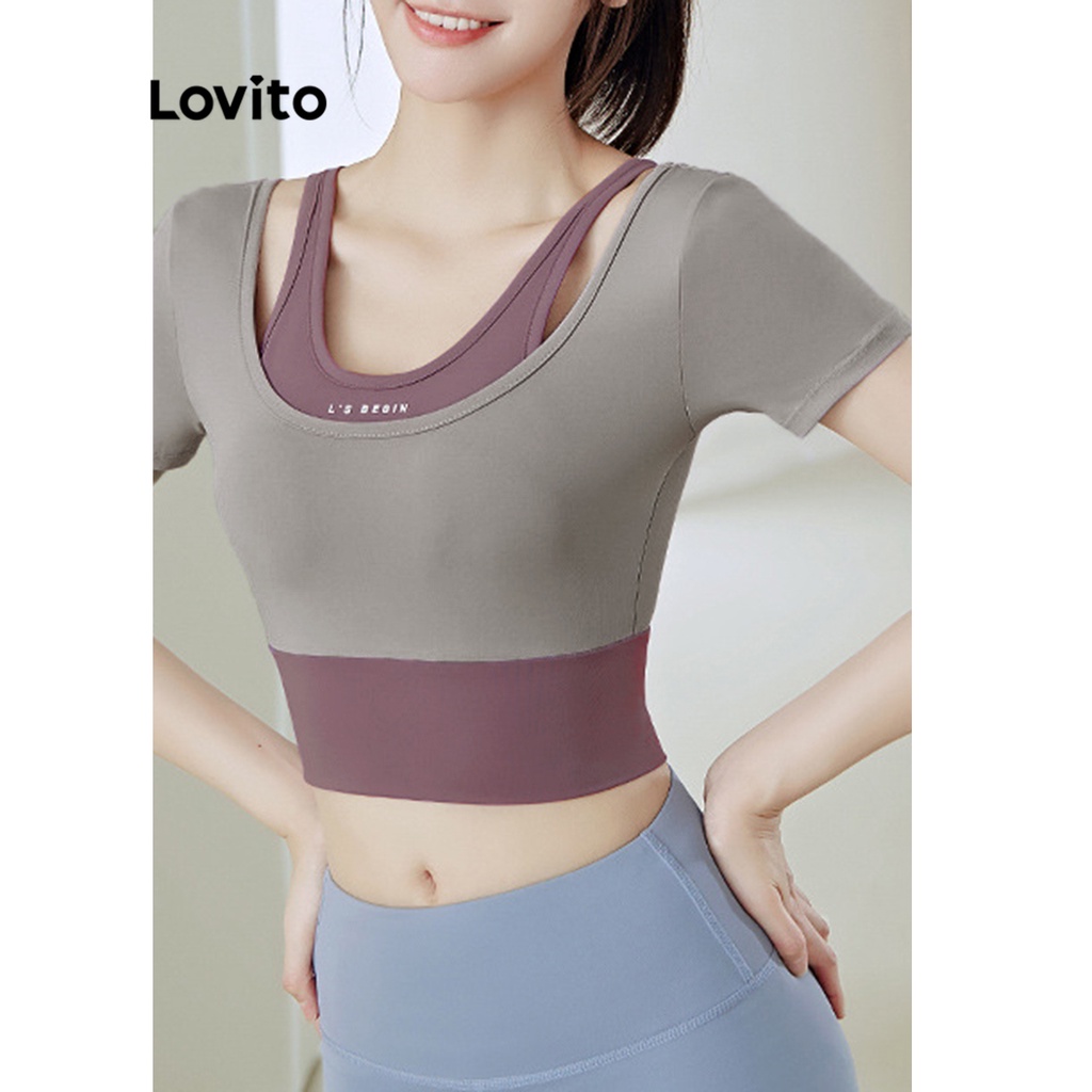 Lovito Sutiãs Esportivos com Letras e Padrão de Blocos de Cor Simples para Mulheres LNA13056 (Roxo/Azul/Preto)