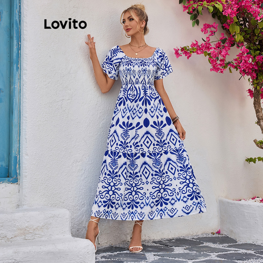 Lovito Vestido de camada dupla com estampa tribal boho e babados para mulheres LBL18560