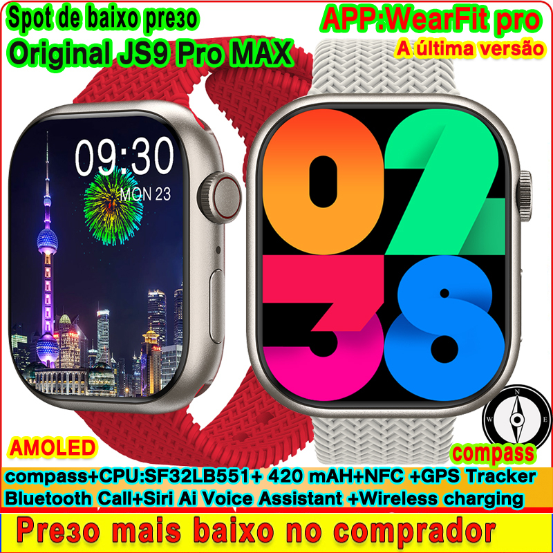Tela Original AMOLED Smart Watch JS9 Pro MAX Série 9 Bússola Bluetooth Chamada NFC Siri Rastreador GPS