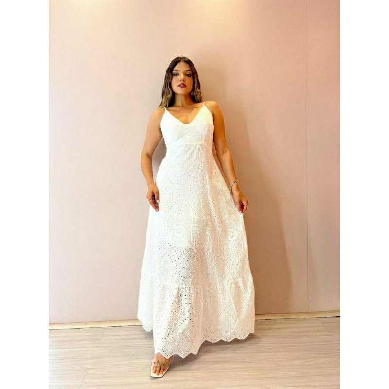 Vestido Longo em Cambraia Bordada, Lese Branco, Rosa e Verde P,M,G e GG