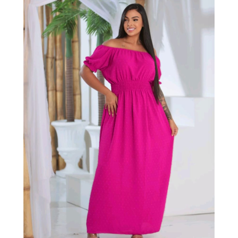 Vestido Pipoquinha longo Rosa Pink moda feminina tecido duna pipoca manga princesa estica veste até plus size EXG festa casamento madrinha
