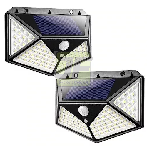 Luminária Solar Automática Recarregável (2PEÇAS) Com 100 Led Luz Fria e Sensor de Movimento Ideal para Iluminar Frente da Casa, Fundos da Casa, Corredores, Pátio de Empresa, Sítio, Chácara, Área de lazer, Área de Piscina, Jardins, Hortas, Área Gourmet etc