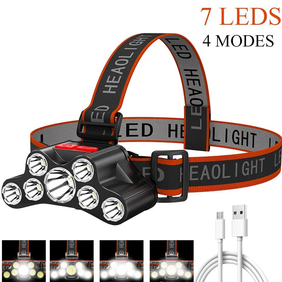 7 Lanterna De Cabeça LED Potente Recarregável Com Bateria Embutida 18650 Para Acampamento Ao Ar Livre
