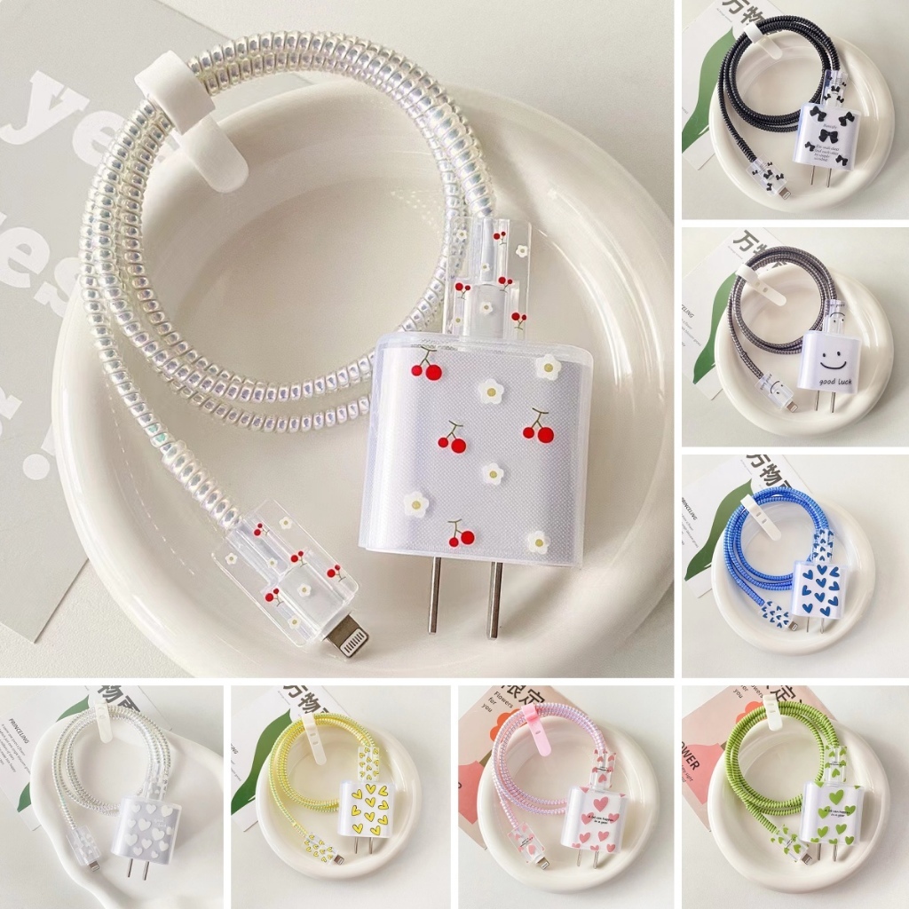 Conjunto De Caixa Carregadora Para Apple 18w/20w Plugue De Carregamento Rápido Capa Macia 5pçs Linha De Cabo Tipo-C Flores De Amor Kaws Protetor De Envoltório De Dados Organizar Arame De Enrolamento Acessório De Amarração