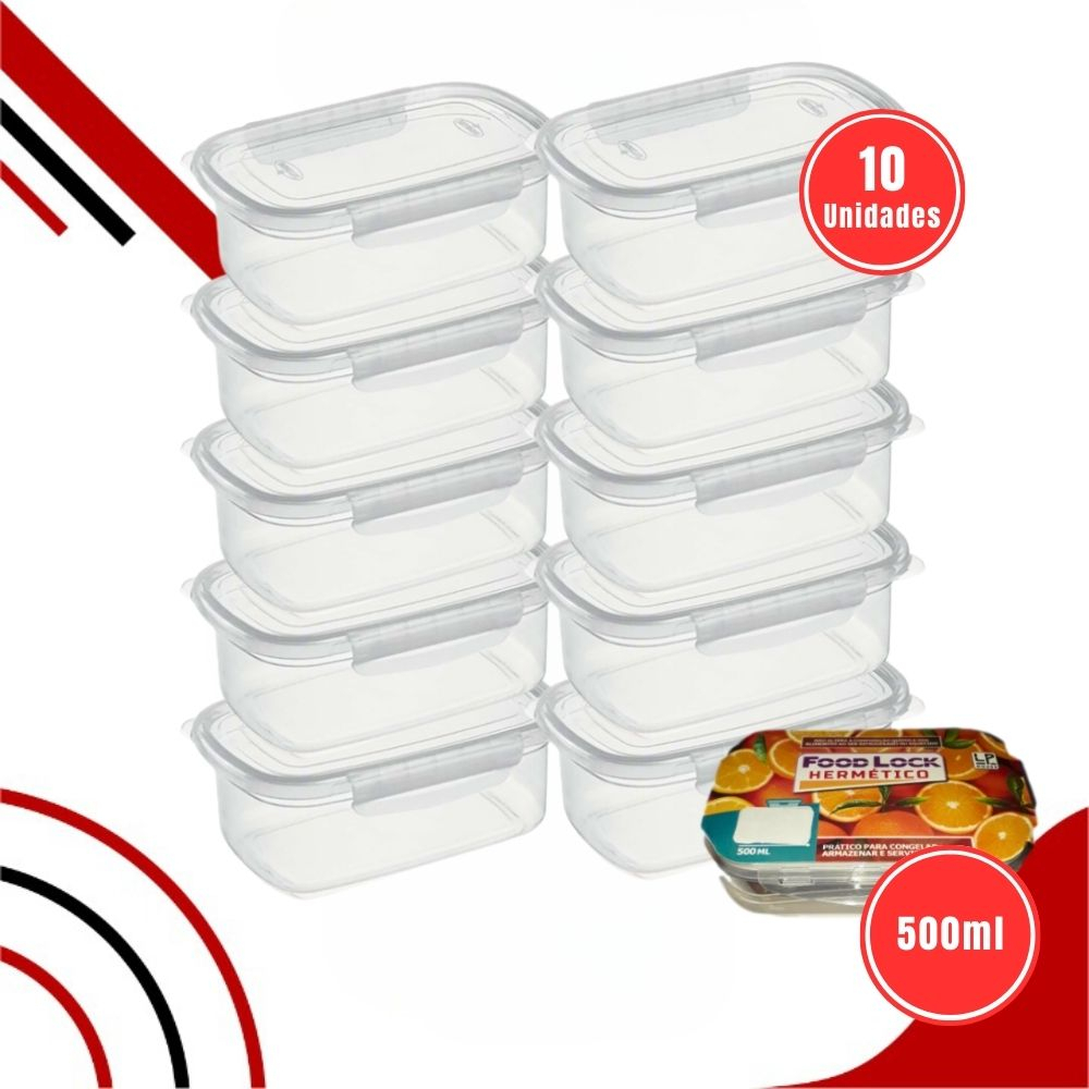 Kit 10 Marmitas Fitness 500ml Pote com Travas Para Freezer e Microondas Plástico Livre de BPA