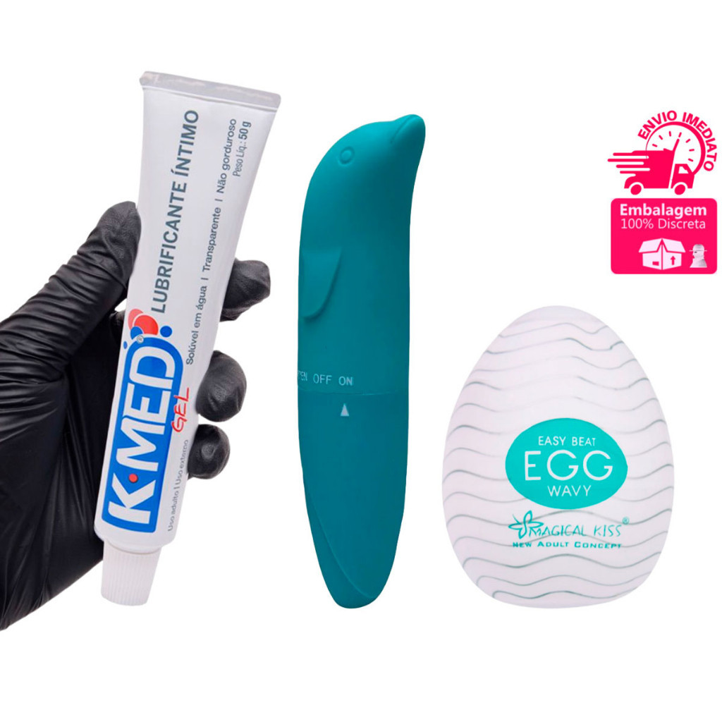 Kit Casal K Med 50g Lubrificante Íntimo à Base de Água + Egg Masturbador Masculino + Vibrador Feminino Ponto G Golfinho Liso