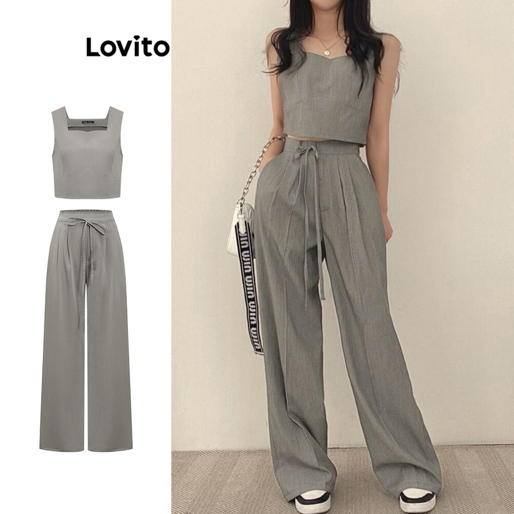 Lovito Conjuntos de calças casuais lisas com cordões para mulheres LBA79159
