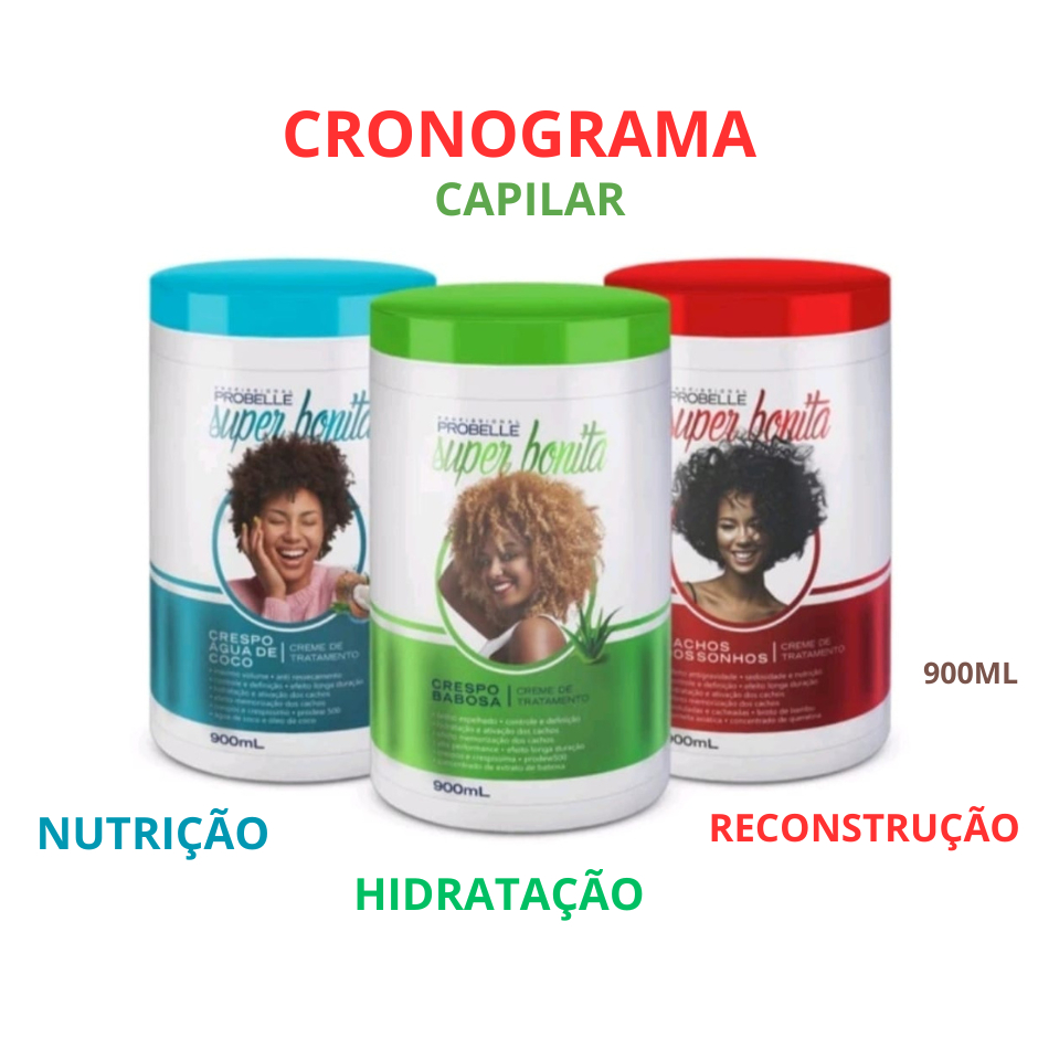 Cronograma capilar Mascara Hidratação Nutrição Reconstrução Creme Cachos Crespos Ondulado Cacheado 900g Probelle Profissional