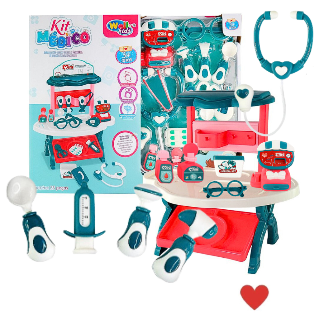 Kit Brinquedo Médico 25 peças Infantil c/ Mesinha Bancada Seringa Estetoscópio Termômetro Caixa de Remédios Otoscópio