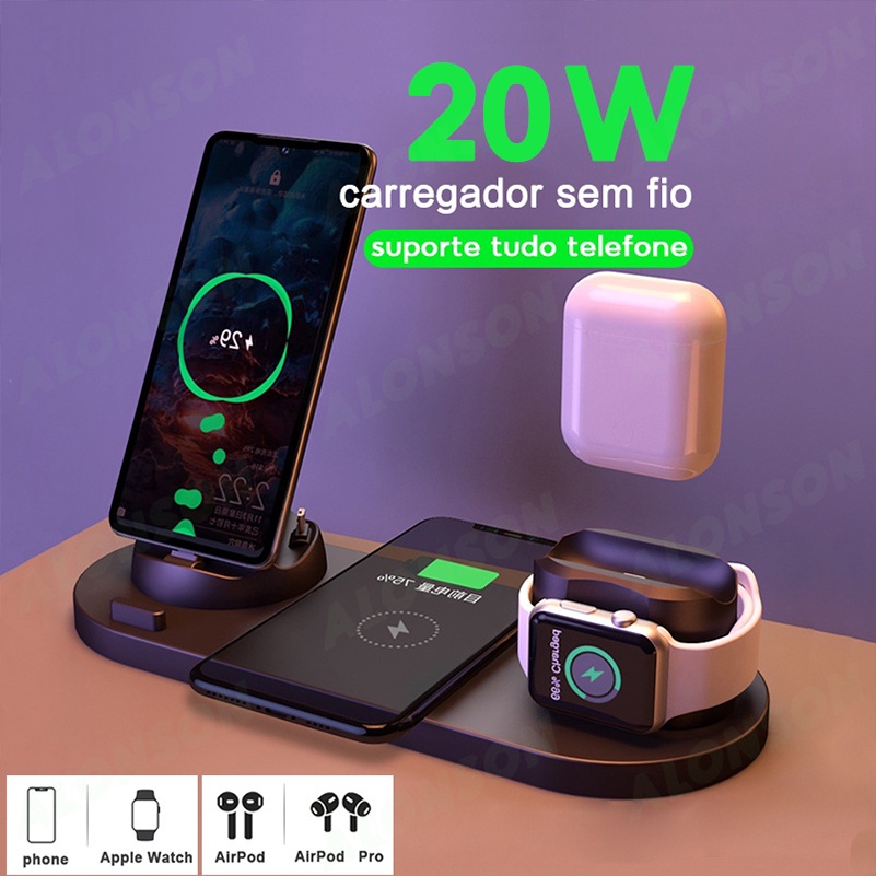 20W Carregador iphone sem fio 6 em 1 Estação de carregamento sem fio para Apple iWatch AirPods Pro Compatível com iPhone Samsung Android