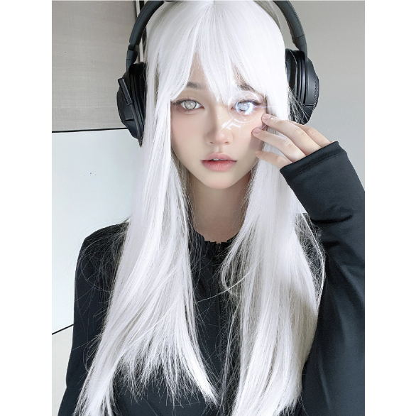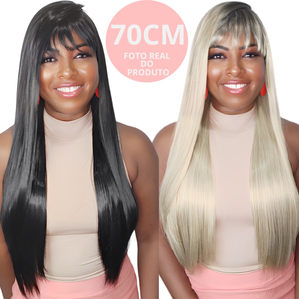 Peruca Lace Wig Longa Lisa Com Franja Branca Fibra 70cm