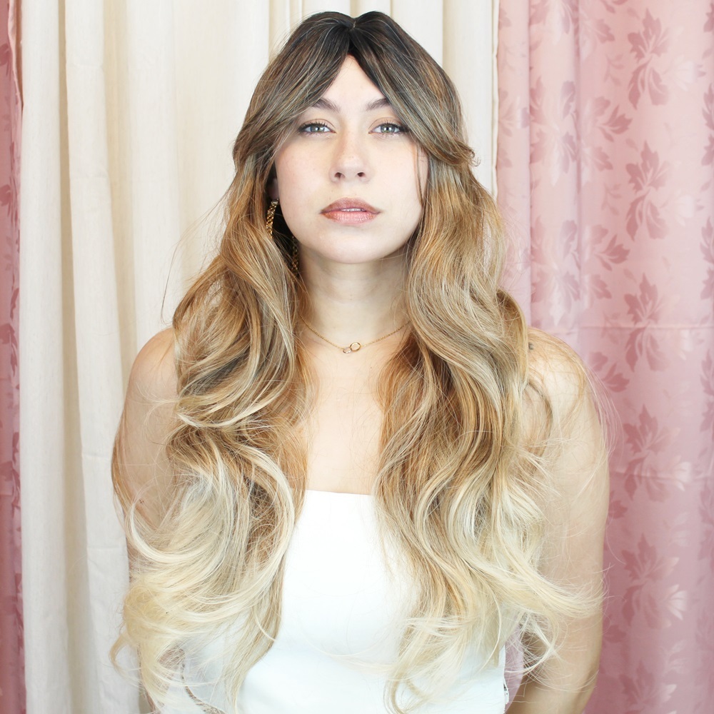 PERUCA WIG ONDULADA COM FRANJA OMBRE LOIRO 65 CM LONGA - FIBRA PREMIUM