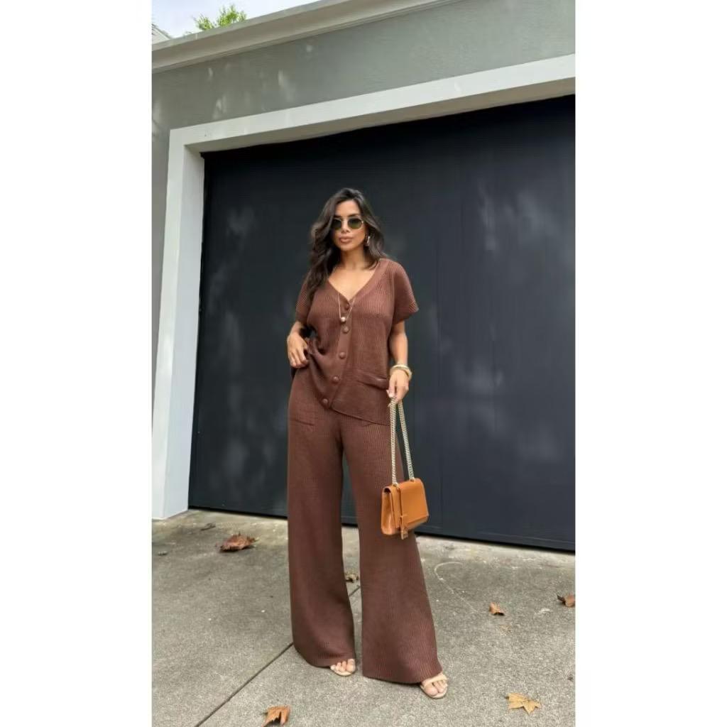 Conjunto Feminino Tricot Calça Pantalona e Max Colete Blusa Regata com Botões Kimono Moda Tendência