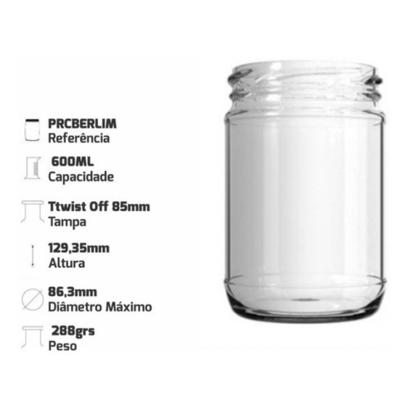 Kit 14 Pote De Vidro Conserva 600ml Berlim Boca Larga + Tampa de Metal
