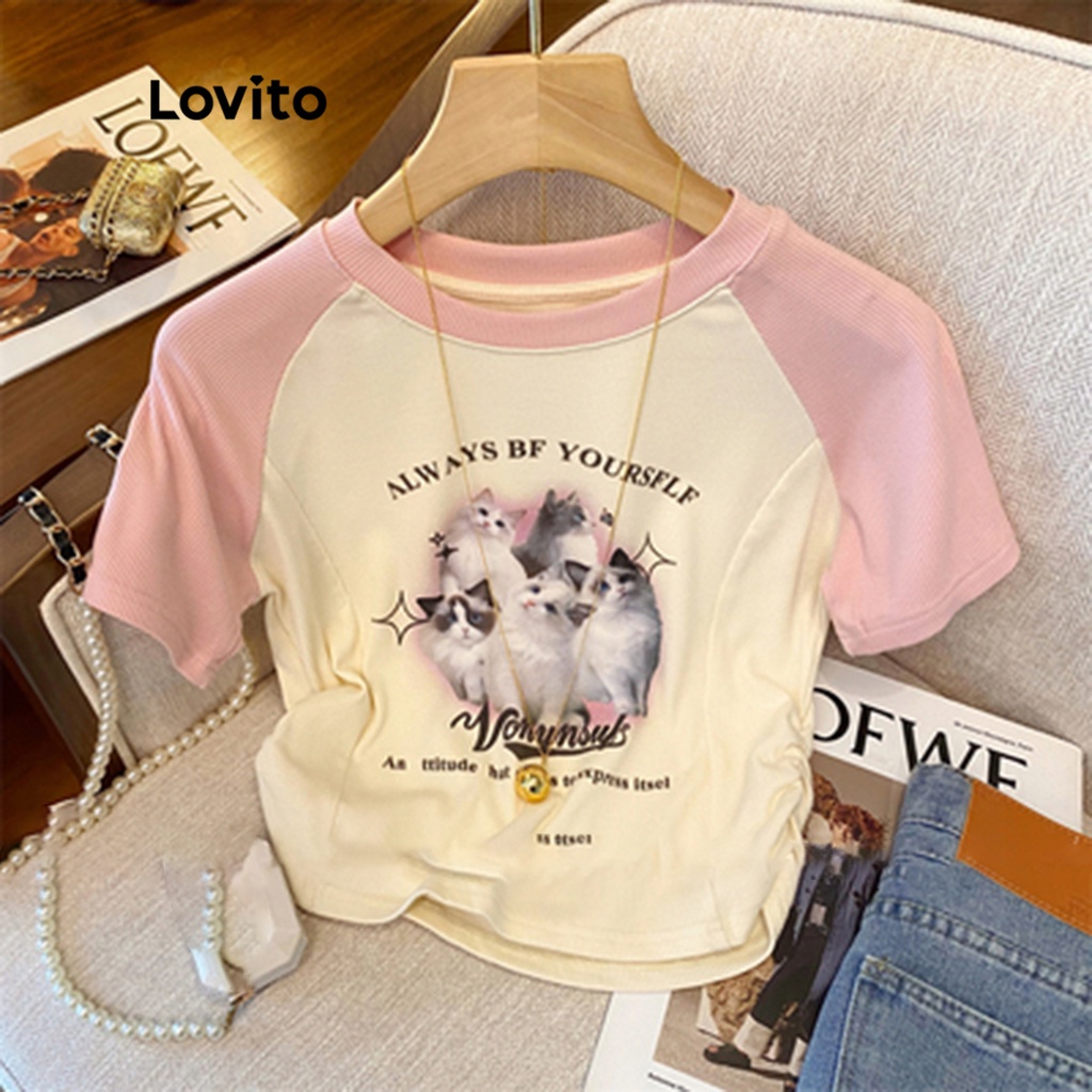 Lovito Camiseta Raglan de Desenho Animado com Blocos de Cor Casual para Mulheres LNE13024 (Rosa)