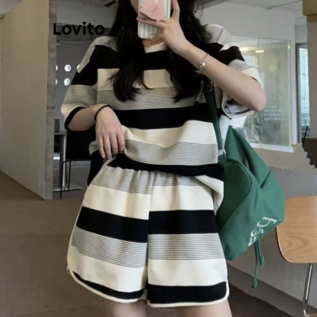 Lovito Casual Conjuntos de Pijama com Padrão Listrado e Contraste para Mulheres LNA18008 (Preto e Branco)