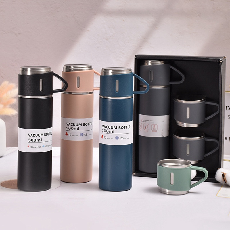 Kit Garrafa Térmica Vacuum Flask Set Inox 500ml + 3 Xícaras - Bebidas quentes ou frias Garrafa de Água Empresarial