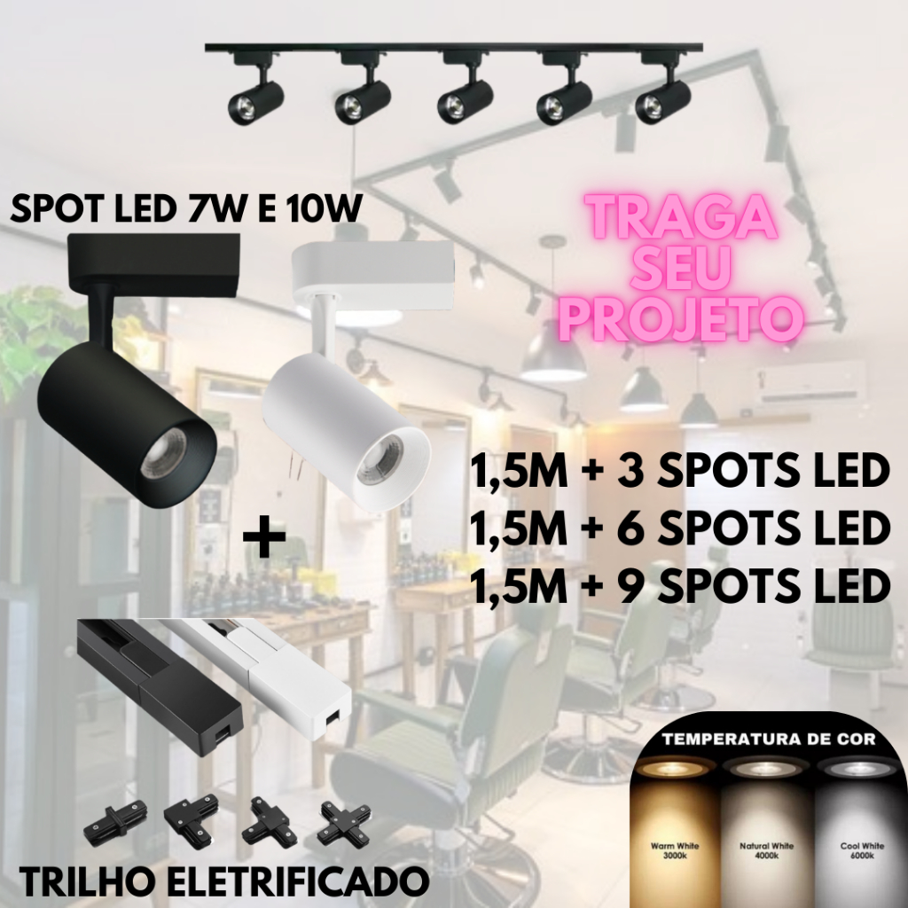 Kit trilho eletrificado 1,5m + spots LED 7w e 10W bivolt direcionavel Casas/Escritórios/Comércios