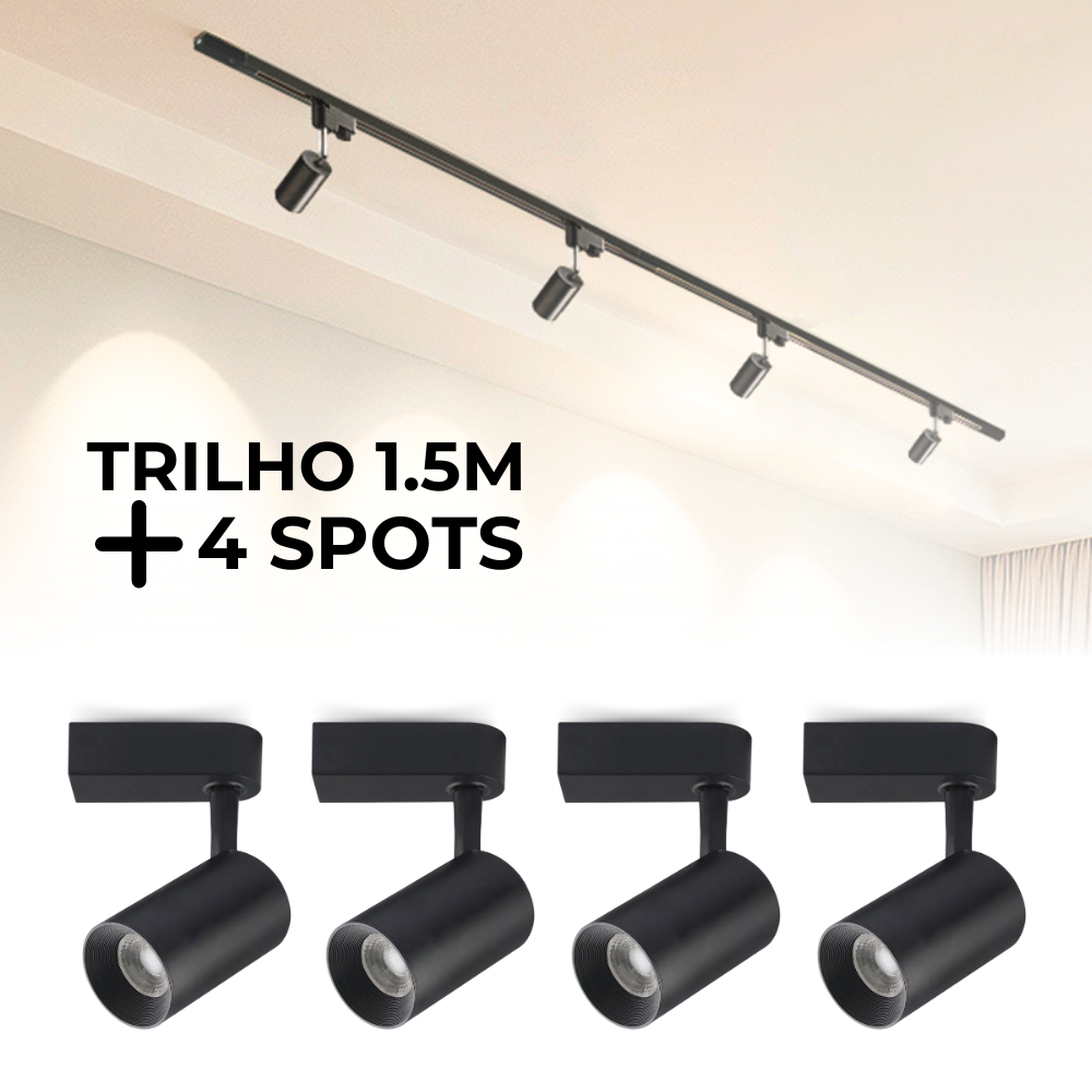 Kit Trilho Eletrificado 1,5m Preto + 4 Spots Led 10w Kit Completo Luz Quente ou Fria Bivolt Spot Direcionável Iluminação