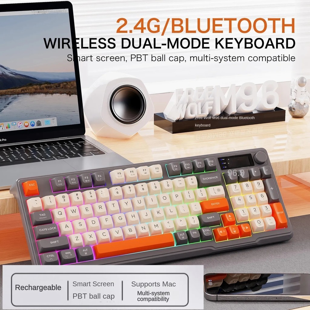 2024 Novo Free Wolf M96 Sem Fio Bluetooth 2.4G Duo Mode Teclado PBT Boné com botão de tela Teclado de escritório para computador