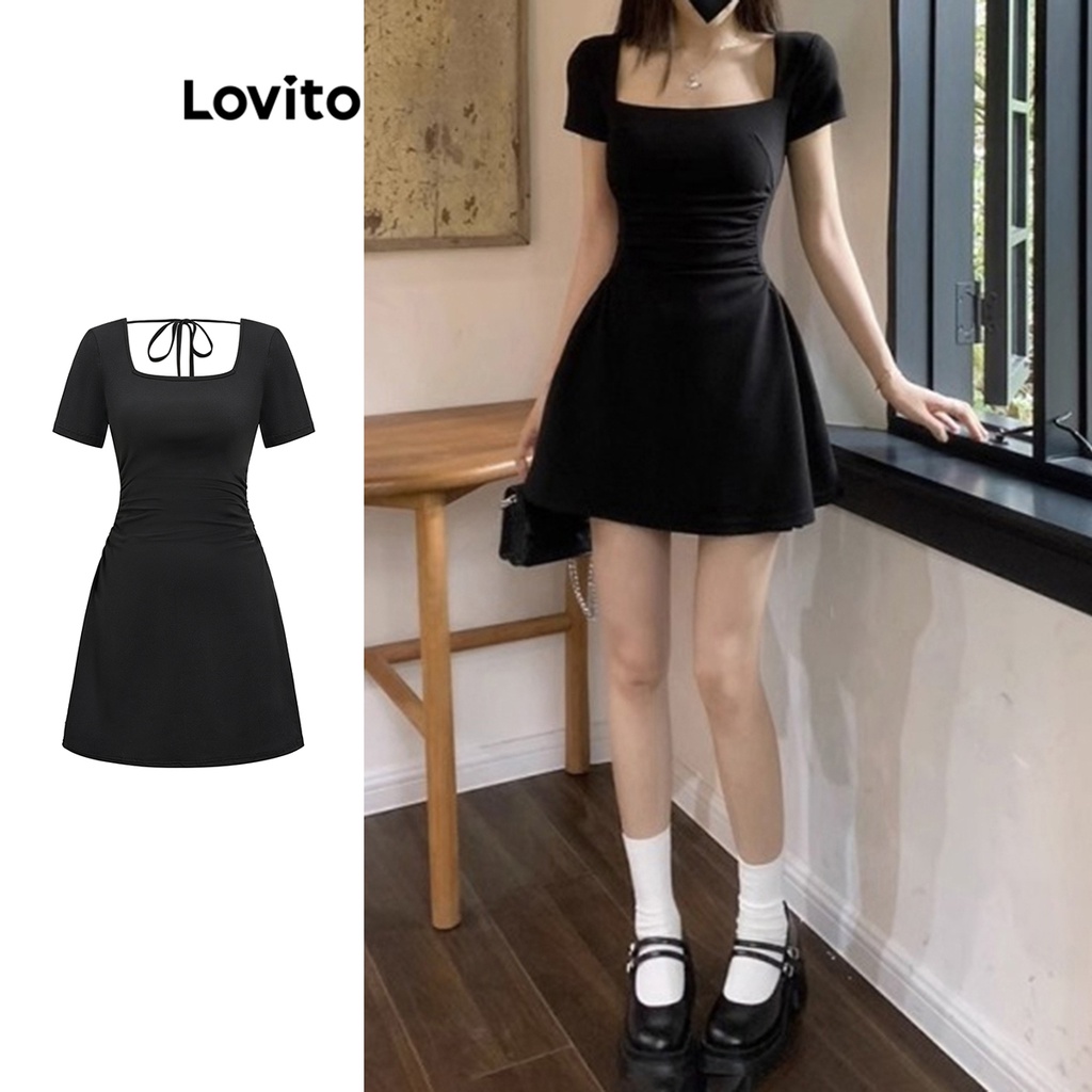 Lovito Vestido com Amarração e Mangas Curtas de Tecido Liso para Mulheres L61AD088 (Preto)