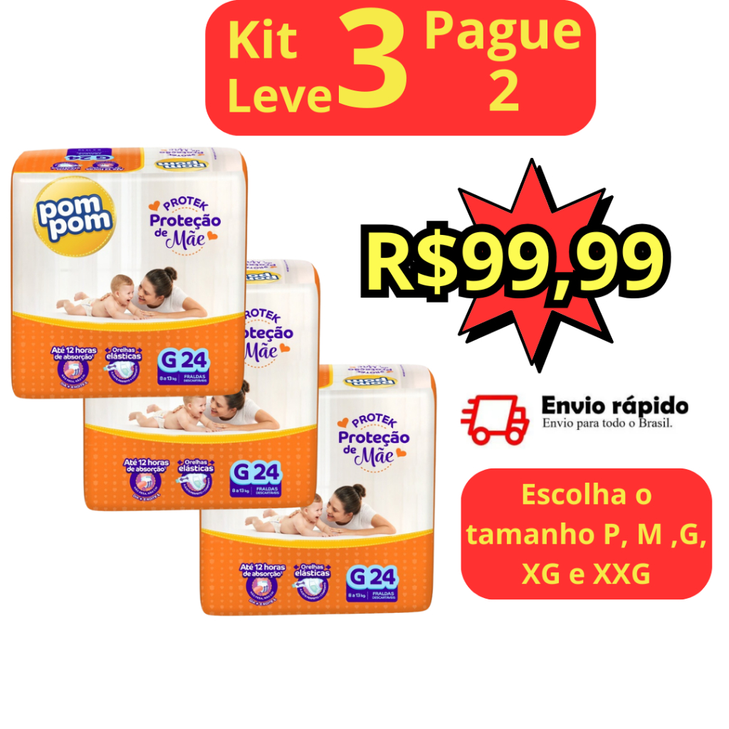 Kit Leve 3 Pague 2 Pacotes de Fralda Pom Pom Derma Protek Proteção de Mãe. Escolha o tamanho P, M, G, XG e XXG