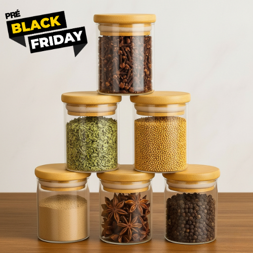 Kit 6 potes de vidro com tampa de bambu herméticos para mantimentos 250 ml