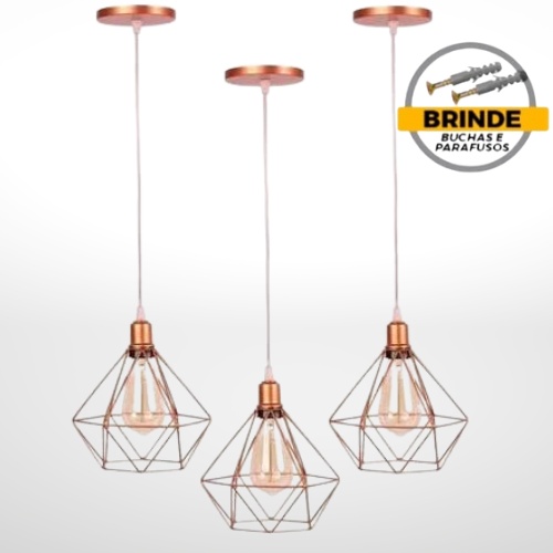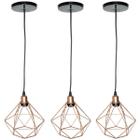 kit 3 Pendente Lustre Luminária Aramado Diamante Rose Gold