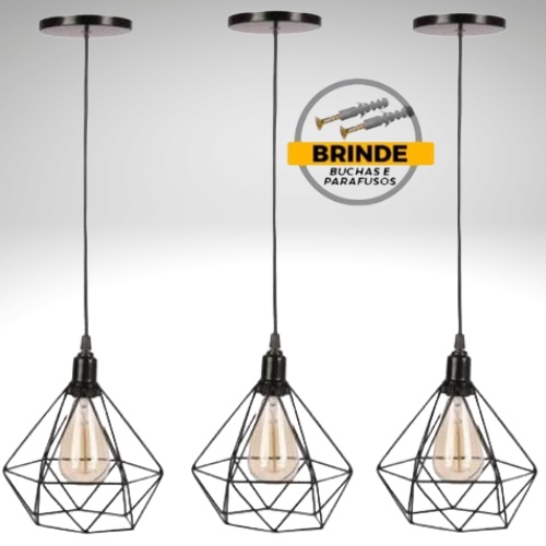Kit 3 Pendente Lustre Conjunto Luminaria Aramado Diamante Cabo Regulável Retrô Vintage Industrial