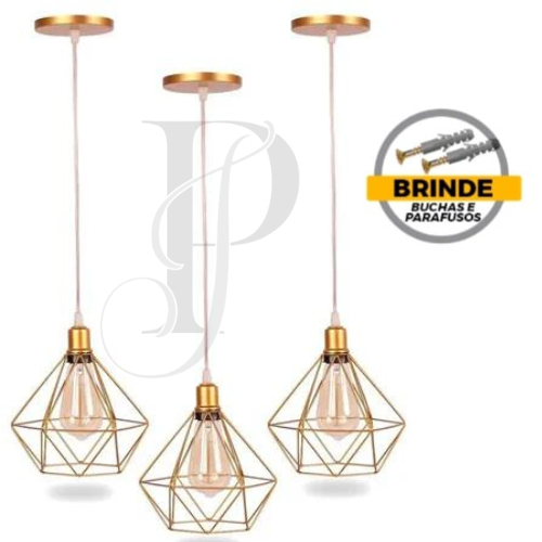 Kit 3 Pendente Aramado Diamante Luminária Lustre Luxo Pequeno Teto Retrô Agp Ilumini Industrial