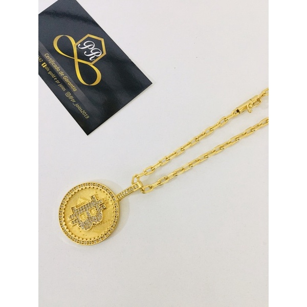 cordão cadeado 3,5mm e pingente bitcoin banhado a ouro 18k 10 milésimos
