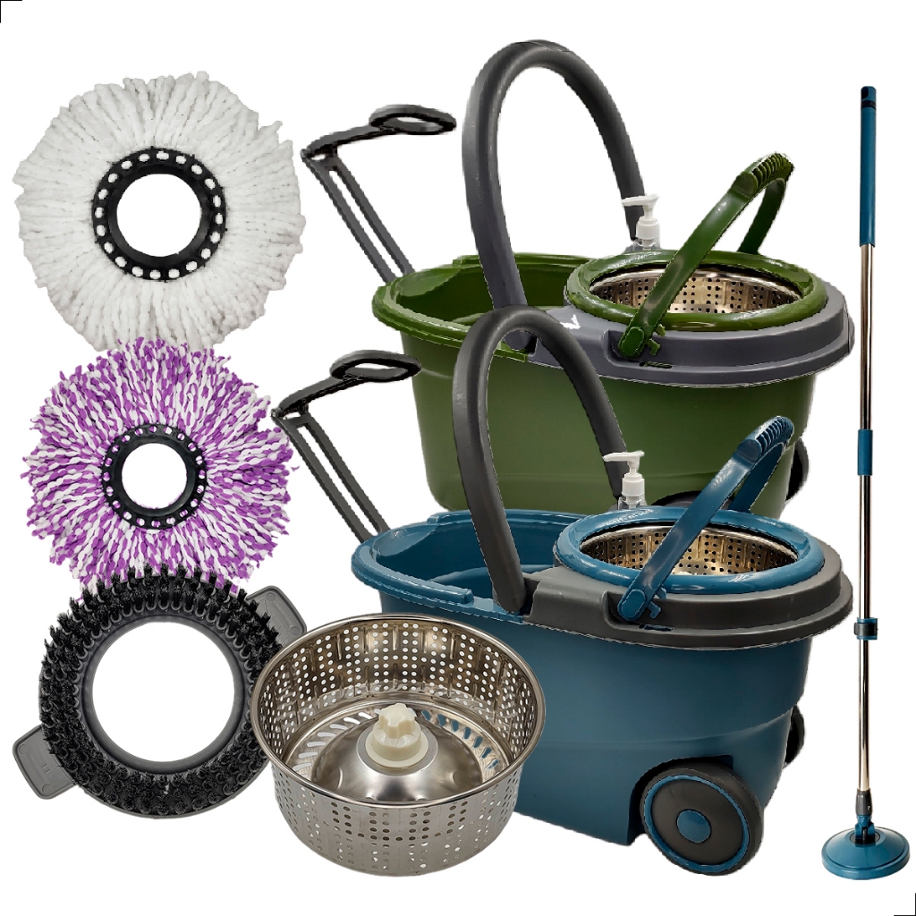 MOP Giratório de Inox Esfregão Multiuso com Refil - Com 3 Refis Lava, Limpa e Seca - Vassoura e Cesto Inox - Balde de 12 Litros para Limpeza Pesada