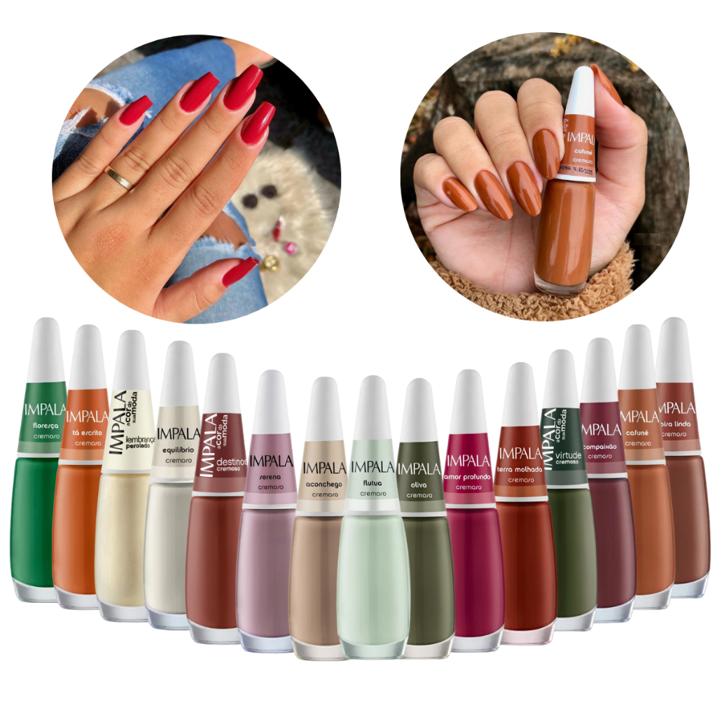 Kit C/15 Esmaltes Impala Cores Da Sua Moda Nude Terracota Cherry Red Manicure Pedicure