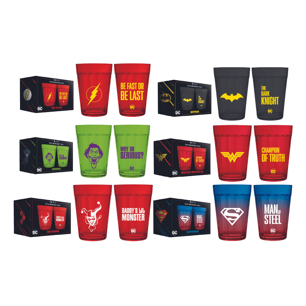 Jogo 2 Copos Americanos 190 ml Geek da Liga da Justiça Presente de Quadrinho Bebidas Agua Suco Refrigerante HQ Super Heroi e Personagens Em Vidro Resistente Colecionavel