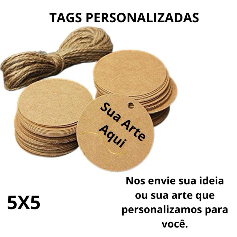 TAG REDONDA PERSONALIZADA EM PAPEL KRAFT 180g 4x4cm E ACOMPANHA CORDÃO SISAL - ENVIO IMEDIATO